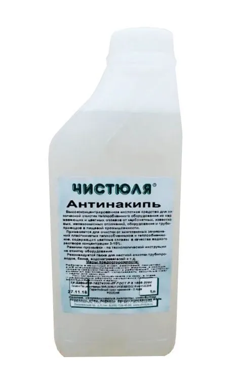 Средство для удаления накипи, известковых отложений и т.д. внутри и снаружи в теплообменниках, котлах, трубопроводах, с оборудования  в пищевой промышленности, в том числе мясомолочной, на предприятиях общественного питания и в быту. Для нержавеющих сплавов и цветных металлов.