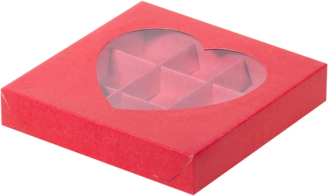 коробка бум. 155х155х30 красная матовая, прозрачное окно сердце
